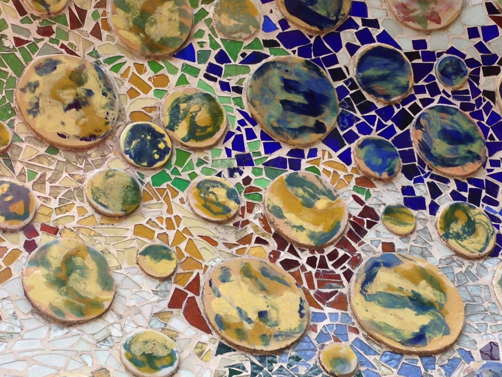 Após definida a ideia e as cores que seriam utilizadas, cortamos as tecelas cerâmicas com alicates torquês, corta fácil e cortador profissional de azulejo. Posteriormente passamos a colar as tesseslas na base de madeira. Aos poucos o mosaico foi tomando forma até que estivesse completo. O esforço e tempo empregados não impediu a conclusão do trabalho e ao final o resultado foi além do esperado e trouxe grande satisfação para todos os membros da equipe.